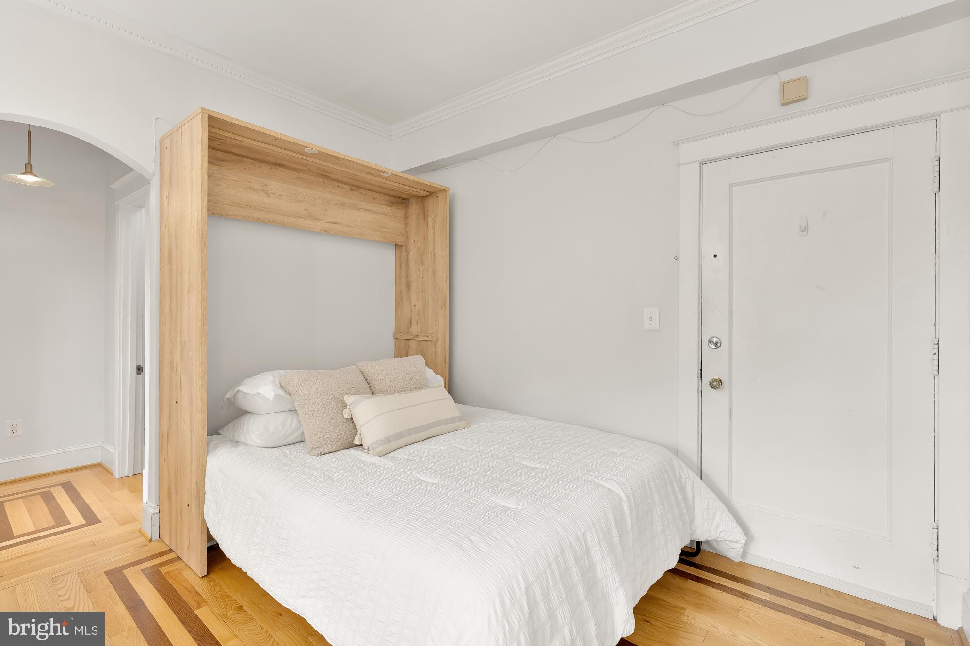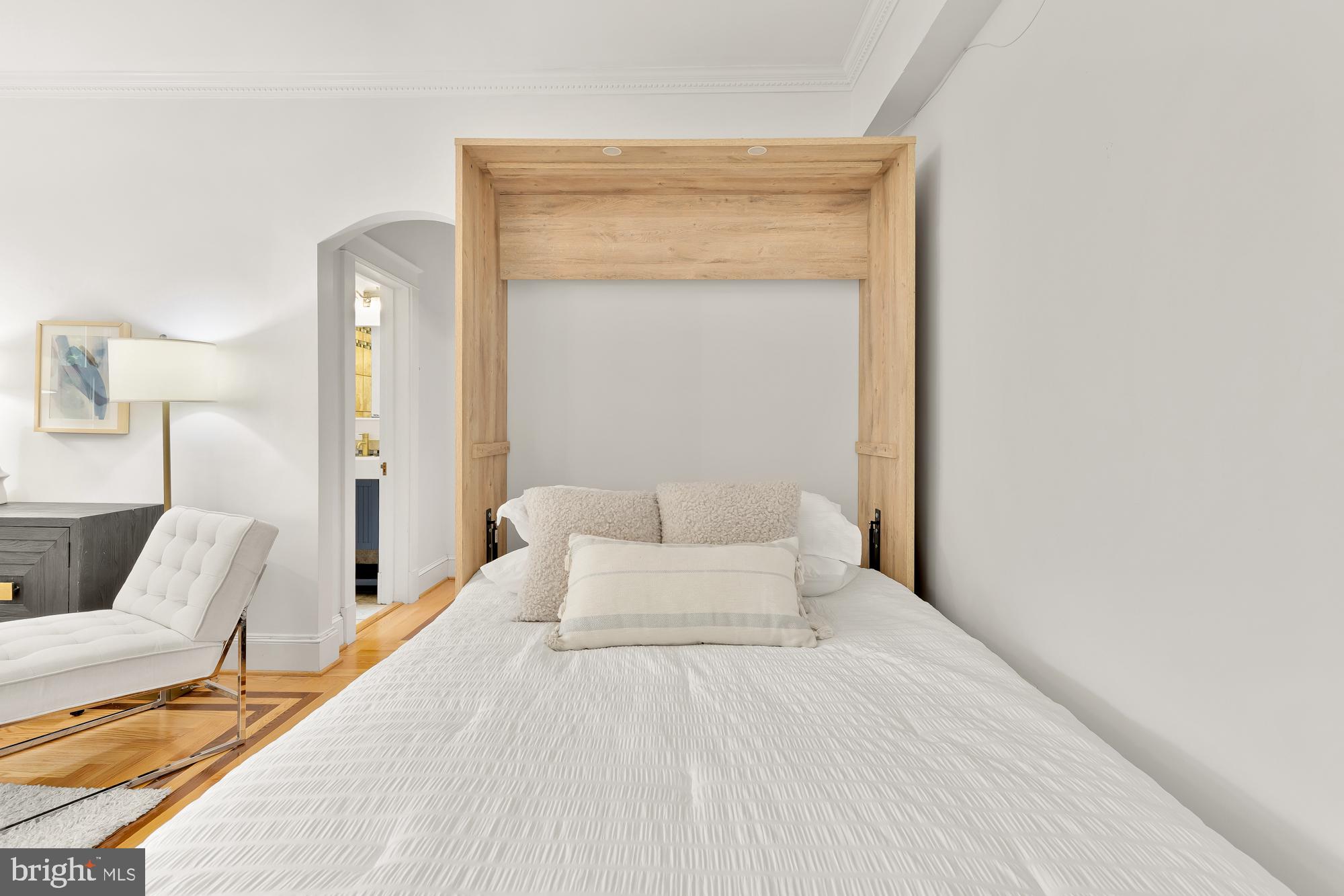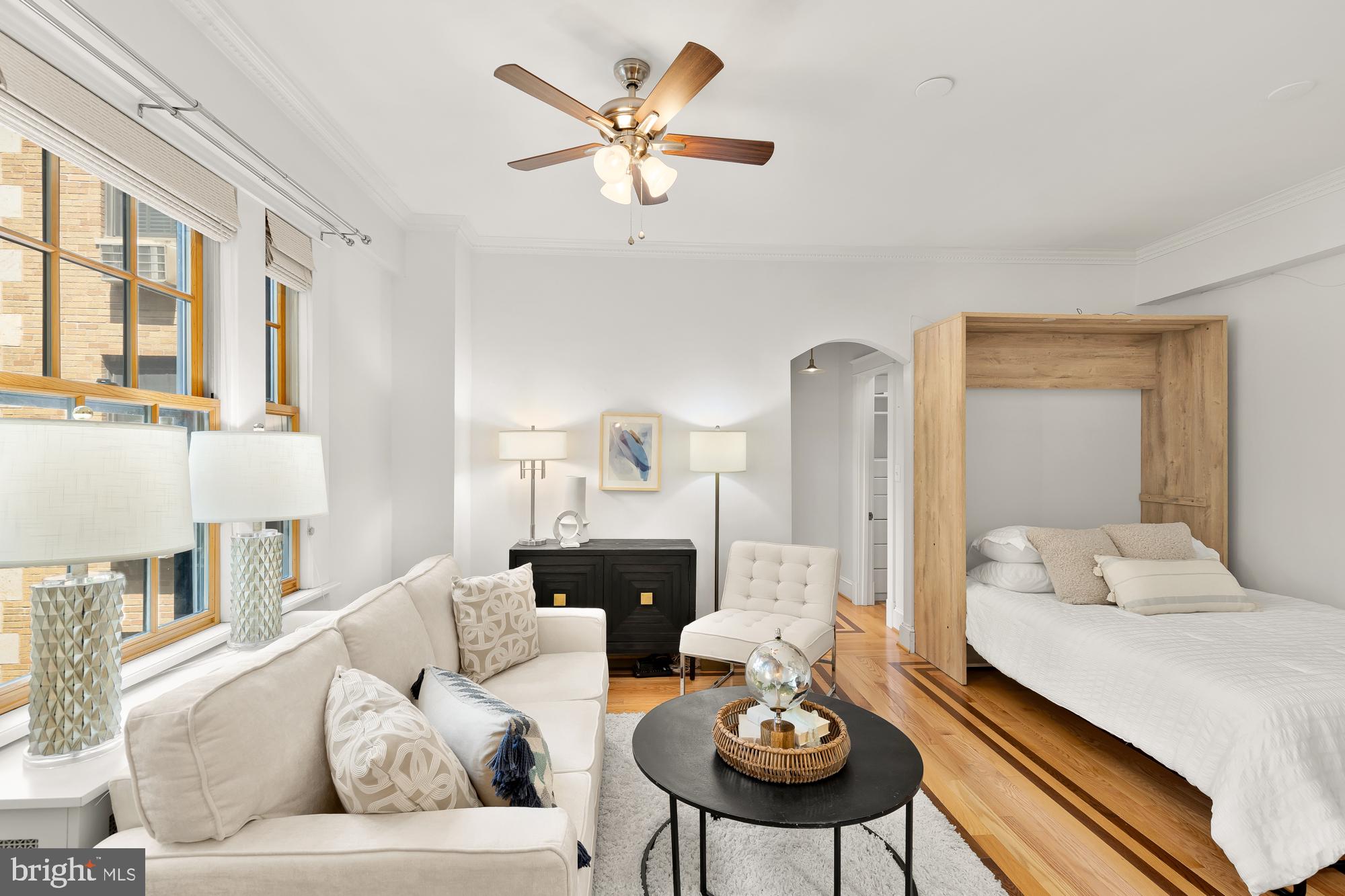 The living area features oversized windows facing Rock Creek Park, gleaming hardwood floors, and a sleeping alcove (Jr. 1 bedroom) complete with a custom queen-sized Murphy bed. In the winter you can see the US Park Police horse paddock and watch the horses play as well as views of the historic bridge and a peak at the National Cathedral.